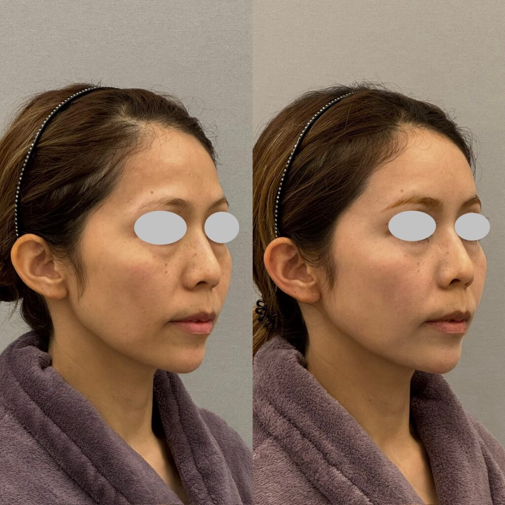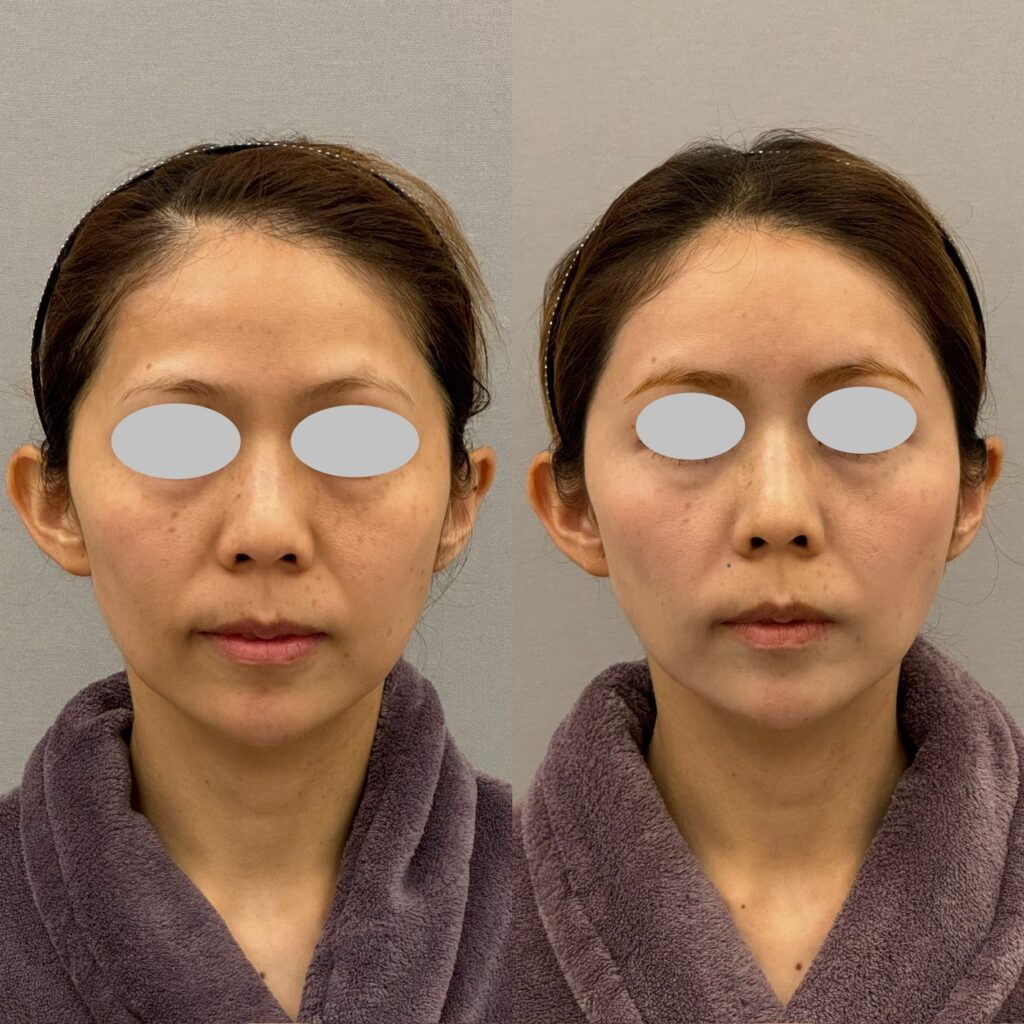 年齢と共に凹凸が出てきてふっくらさせたいというお悩みでした。額、こめかみ、頬の高さ、目の下、頬コケ、ほうれい線に注入しています。全体的にボリュームが戻って若返って柔らかい雰囲気になったかと思います。加齢と共に骨や筋肉や皮下組織のボリュームが少なくなるので全顔脂肪注入によってボリュームロスを補うことはアンチエイジング効果が絶大です。脂肪吸引、豊胸と同時だとか香料も無料になるので同時施術もおすすめです。