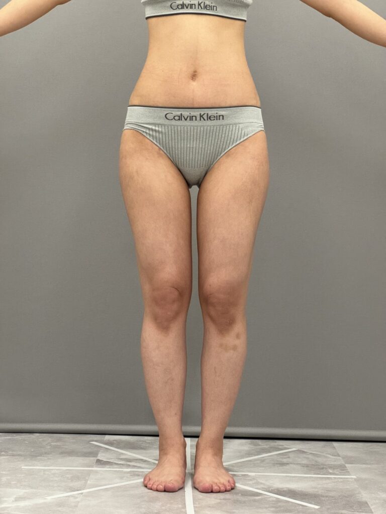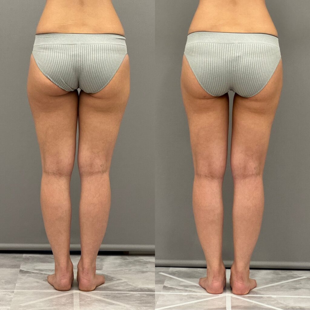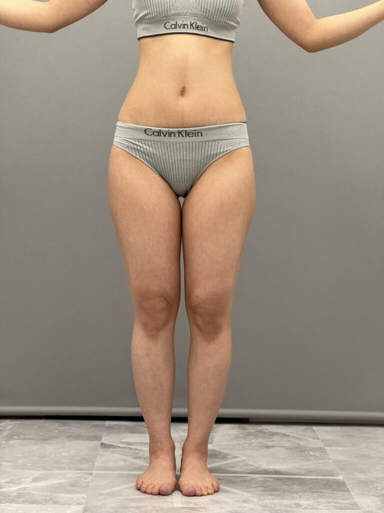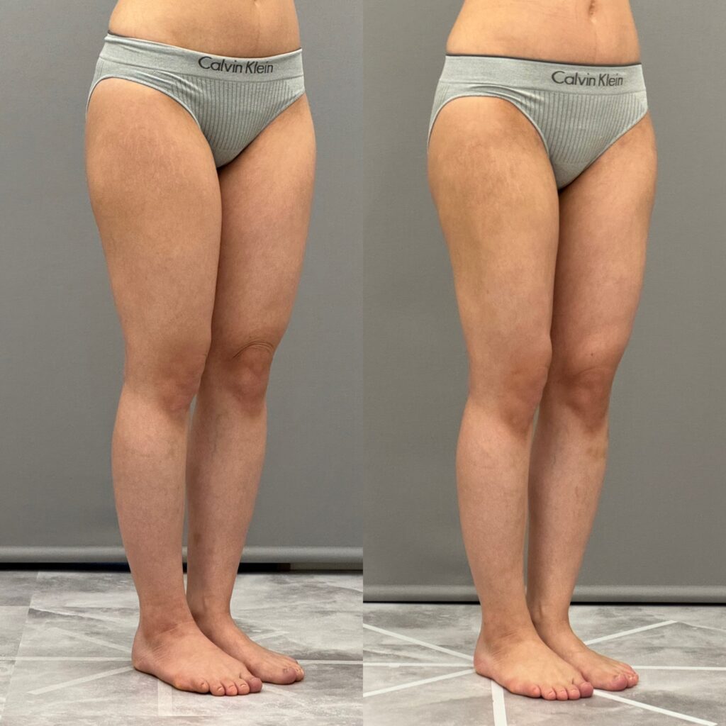 太もも全周を吸引した症例です。内ももやお尻の張り出しが気になる方は多いと思います。3ヶ月経過してスッキリして細くなりましたね。内ももに隙間もできました。まだ6ヶ月まで引き締まってさらに細くなります。当院ではパーツごとでも可能ですが、全周で吸引していただいた方が仕上がりがきれいなのでお得なセット価格もご用意しています。気になる1部位からでもOKです。