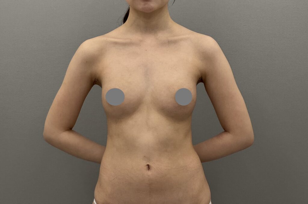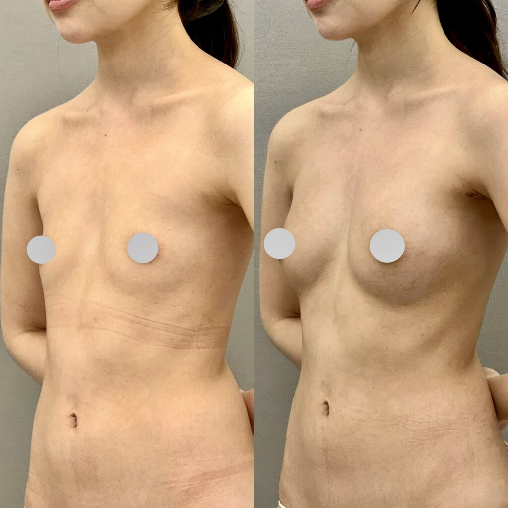 脂肪豊胸の症例です。二の腕と太ももそ外ハリが気になるということで二の腕、肩、太もも外の3部位から採取を行い脂肪F豊胸を行いました。左右3000ccずつ注入できました。出産経験はなしですが皮膚の伸びがよかったこともありしっかりと注入できました。脂肪豊胸なら二の腕などの脂肪が比較的少ない部位からでも豊胸が可能になります。術後1ヶ月経過ですが定着もとても良さそうです。仕上がりが楽しみですね。