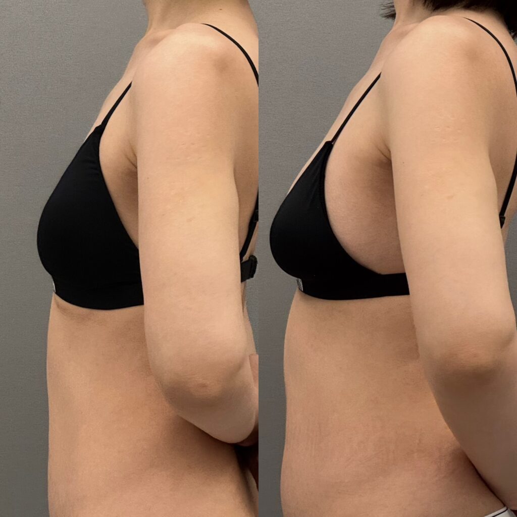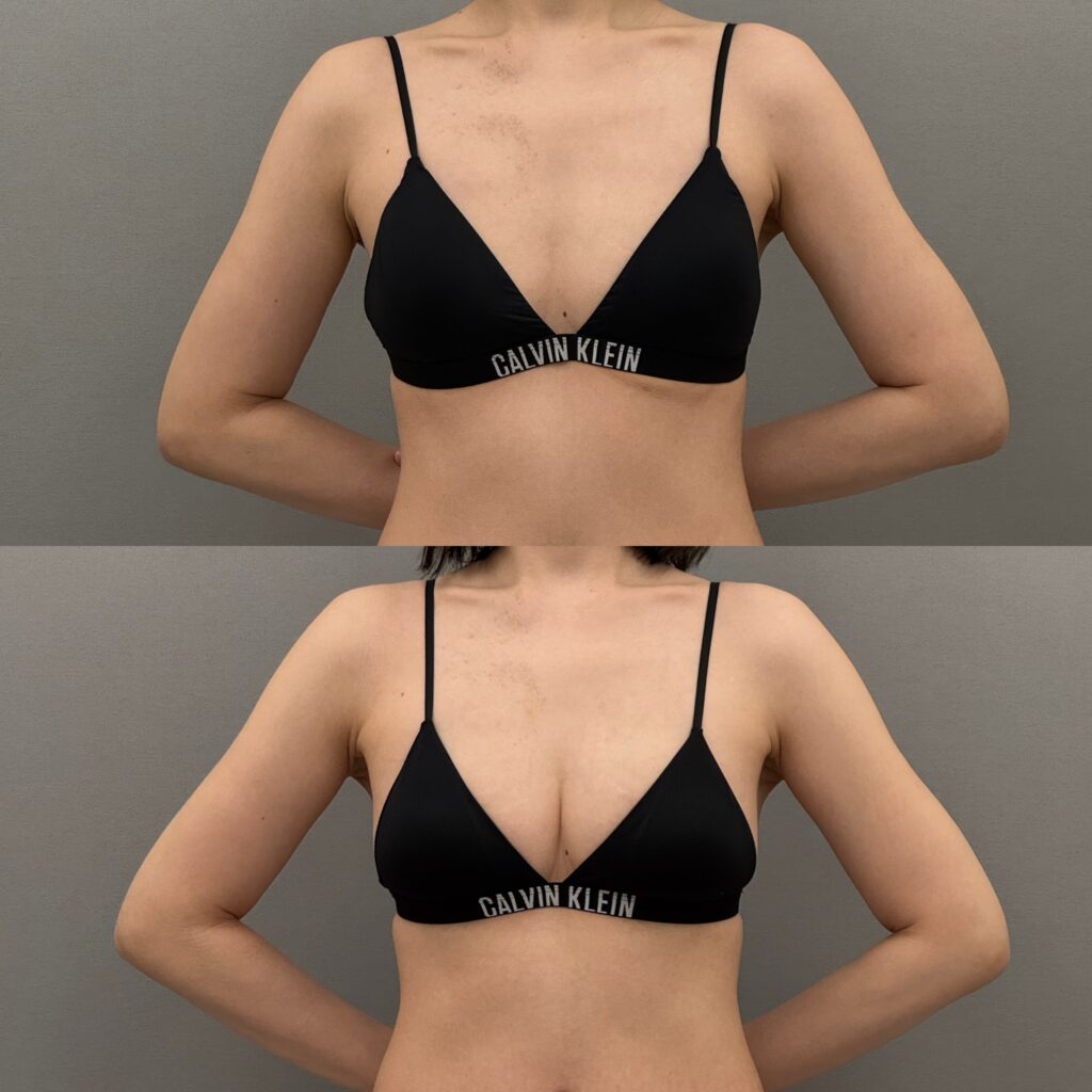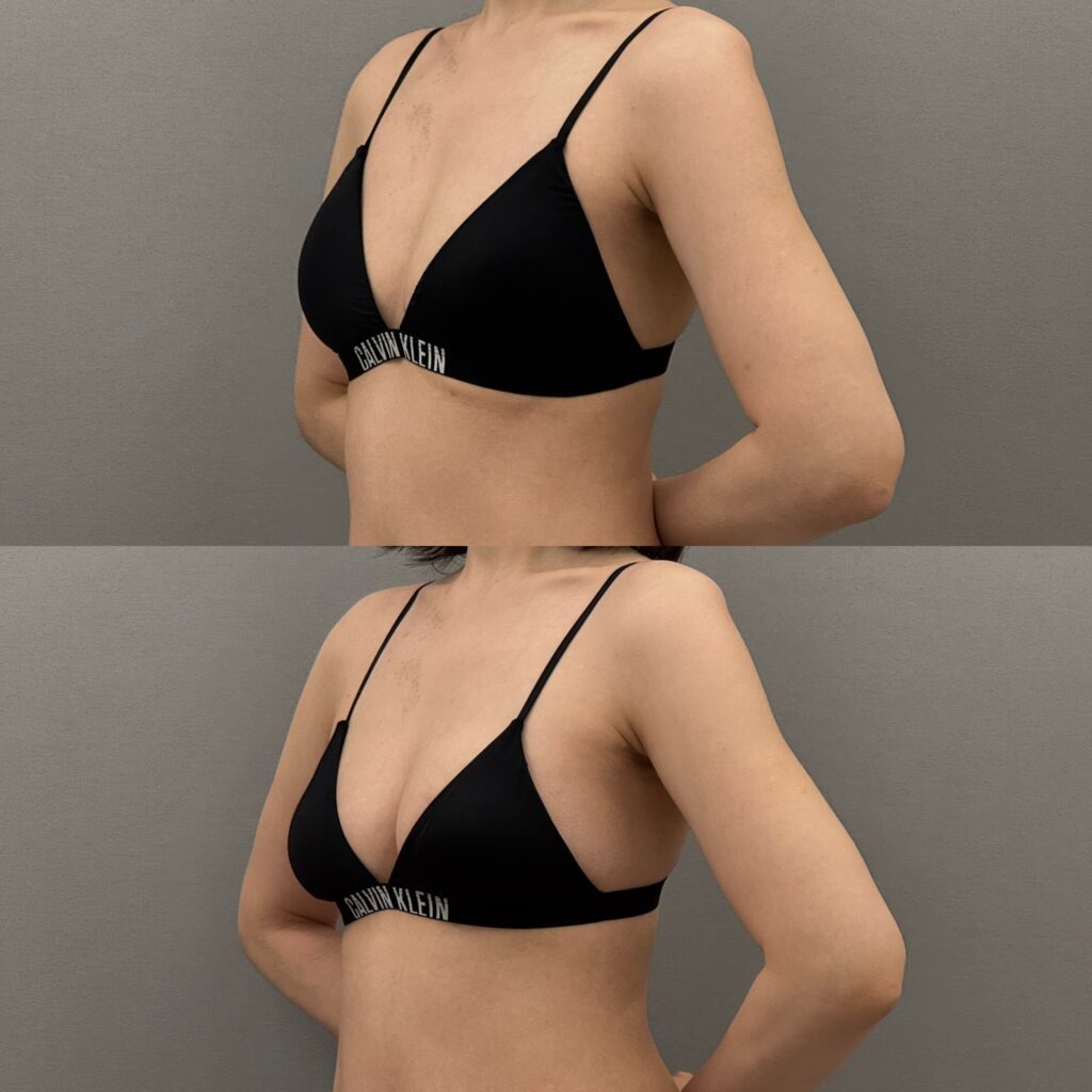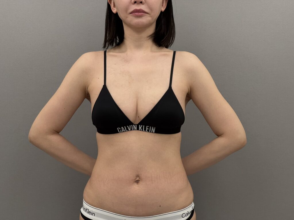CRF豊胸の症例です。太もも全周から採取を行いCRF豊胸を行いました。左右300ccずつ注入できました。授乳後ということもありしっかりと注入できました。脂肪がある程度余裕のある方でCRFを行えるのであればしっかり注入するのが一番だと思います。術後3ヶ月経過して定着は完了しましたがハリもボリュームもついてとてもいい仕上がりになりました。