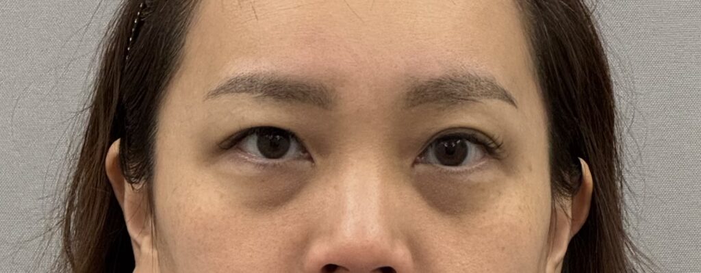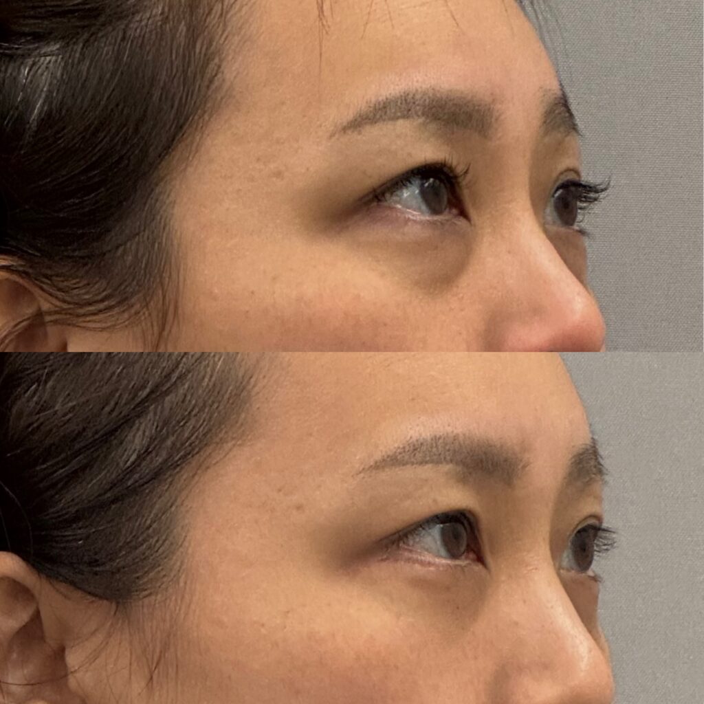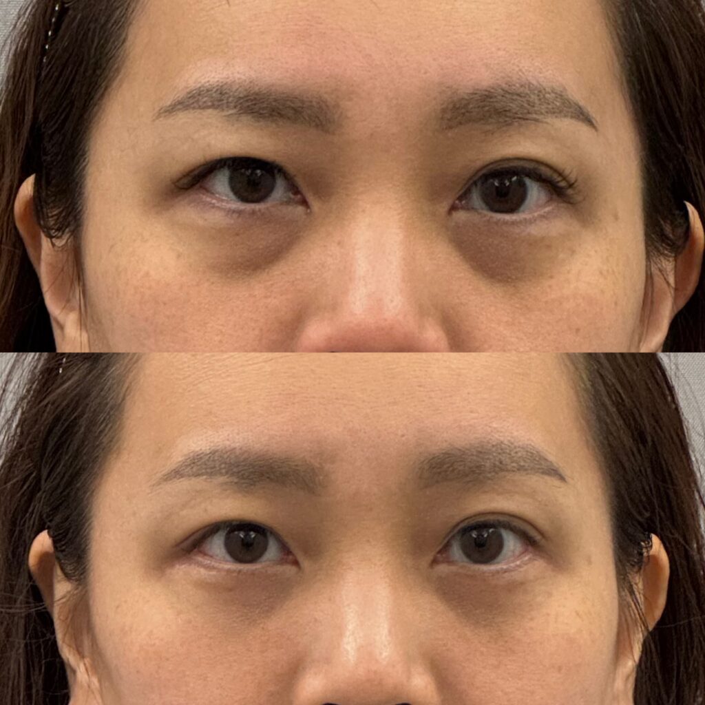 クマのお悩みでした。年齢とともに目の下の脂肪が飛び出してきて影ができることでできるいわゆる黒クマ、影クマが原因でした。一部色素沈着も見られるのでこちらは手術では改善しないため後日別の治療が日強いうになることもあります。ただ気になる突出や溝が良くなると気にならなくなることも多いです。脂肪をとるだけではしわが目立つ可能性があるため表ハムラで行いました。疲れ顔と感じていたのは全く感じないですね。傷は半年後まで赤く目立つ生地がありますが最終的にかなり目立ちにくくなります。
