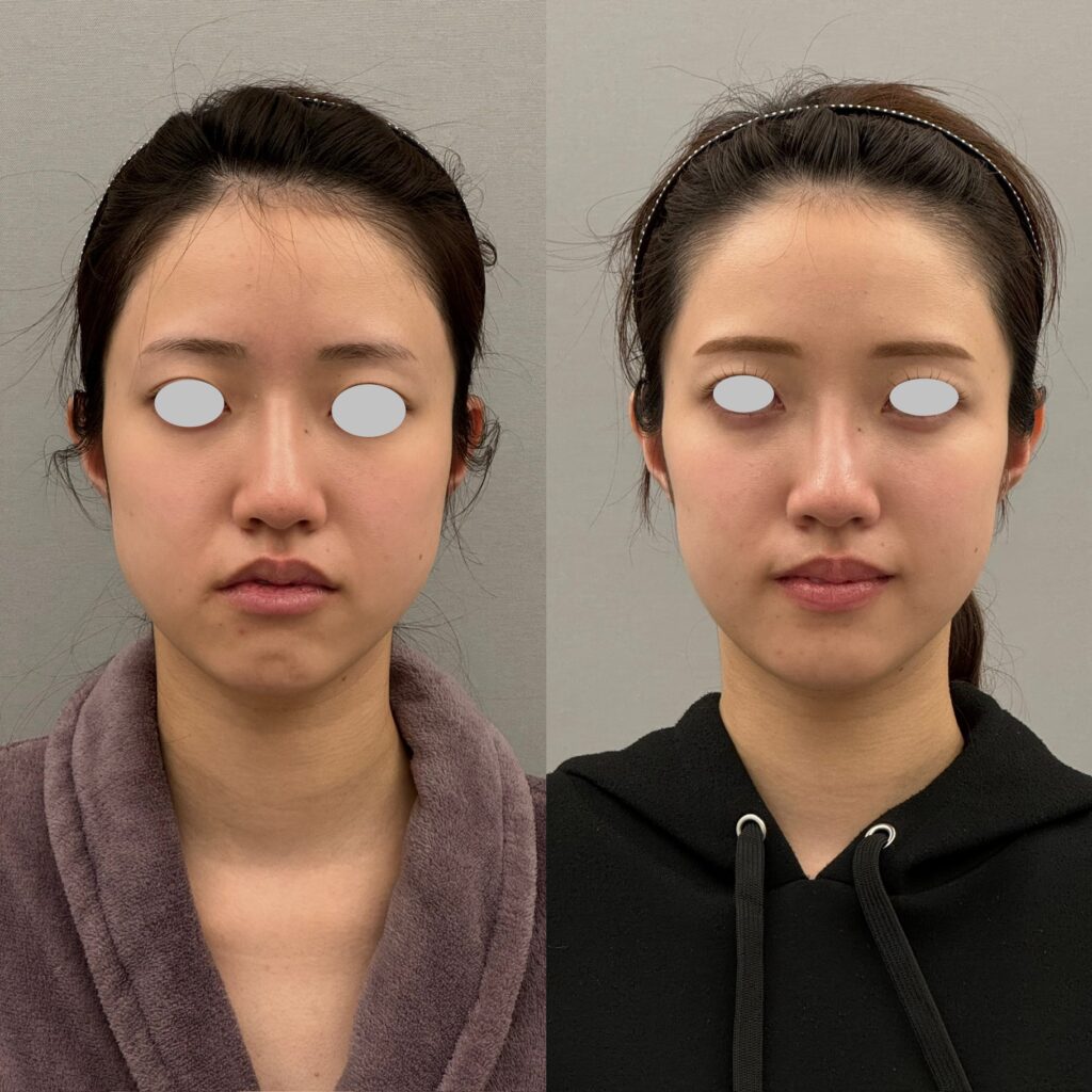 顎下の脂肪、弛みが気になるとのことで顎下のVASER脂肪吸引を行いました。頬は脂肪が少なく、咬筋の発達によってエラが張っていたことからエラボトックスも同時行いました。顎先が常に緊張して皺になっており本来の顎の形が出ていなかったので顎先ボトックスも併せて行うことでEラインが整って斜めや横から見たフェイスラインがよりすっきりと整いました。料金:VASER脂肪吸引 顎下 270,000円(税込)、ボトックス(ボトックスビスタ)1V50単位 49,500円(税込)、別途静脈麻酔代や血液検査代や圧迫着代がかかります。副作用・リスク:出血、感染、傷跡、色素沈着、凹凸が生じる可能性、一時的な感覚の低下、左右差を生じる可能性、一時的な顔面神経麻痺、理想とする仕上がりと異なるなど。