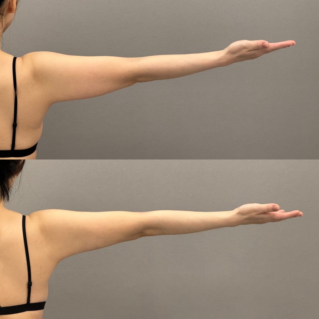 30代女性 二の腕をスッキリさせたい、上半身をスッキリ見せたい。二の腕の脂肪はしっかり、側面は肩からストンとまっすぐなラインになるよう吸引しました。ダイエットでは難しい二の腕の部分痩せは脂肪吸引がおすすめです。完成が楽しみですね。料金:VASER脂肪吸引(二の腕・肩)498,000円(税込) 別途静脈麻酔代や血液検査代や固定着代がかかります。副作用・リスク:出血、感染、色素沈着、傷跡、凹凸を生じる可能性、左右差を生じる可能性、理想とする仕上がりと異なるなど。
