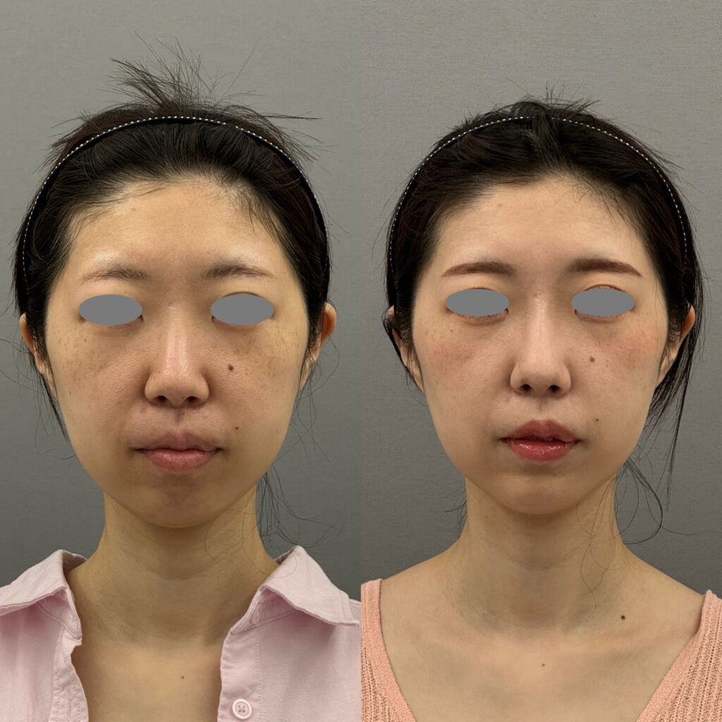 30代女性 フェイスラインが悩みとのことでした。脂肪が少ない、下顎がやや低形成のため吸引で理想の変化を出すのが難しい症例でした。ヒアルロン酸とボトックスでフェイスラインを整えてスッキリ見せる方針としました。ほうれい線にもヒアルロン酸を注入しています。どの方向から見てもシュッとしてスッキリとした印象になりましたね。吸引は引き算ですが、足し算も必要な時があります。料金:ヒアルロン酸1cc 77,000円~(今回はボリューマ1cc,ボラックス1ccを使用)、ボトックスビスタ4,9500円 副作用・リスク:出血、感染、アレルギー、しこり、血管塞栓、理想とする仕上がりにならない可能性があるなど。