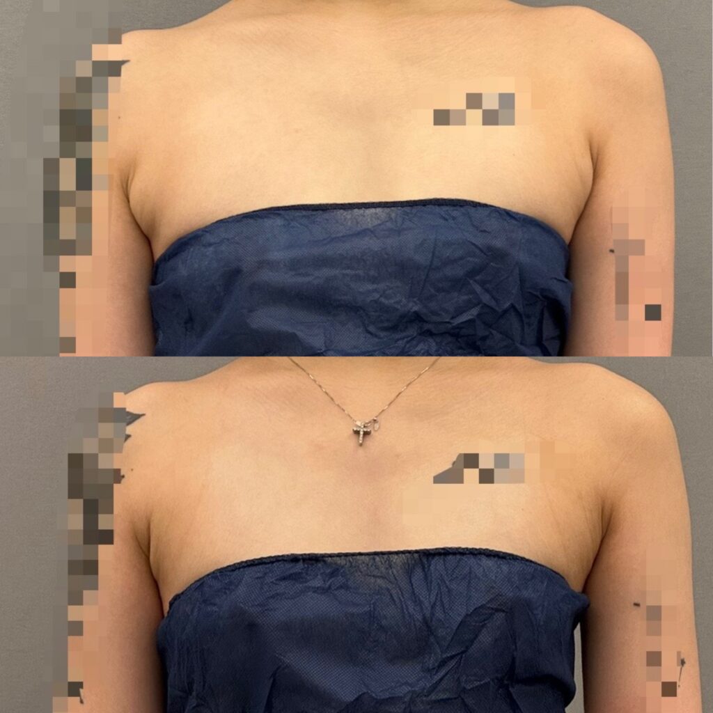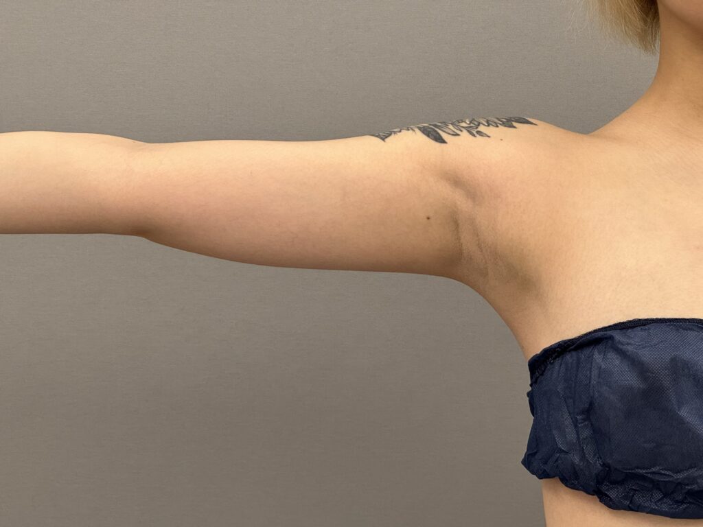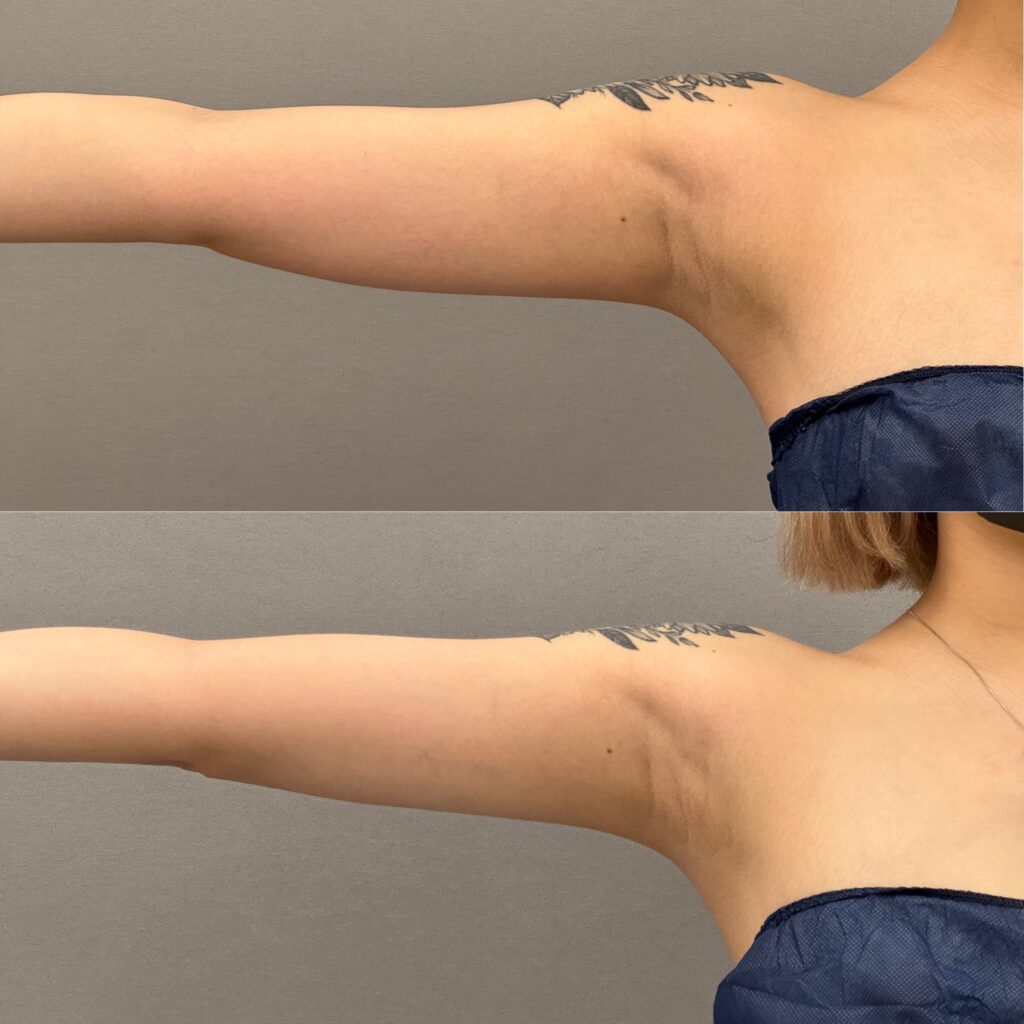 20代女性 161cm 51kg BMI19.7 二の腕を脇肉の脂肪が気になる。細身ですが運動しても落ちにくいのが二の腕の脂肪です。特に脇肉はダイエットではどうすることもできません。二の腕に加えて脇肉前後も合わせて吸引することでさらに華奢な上半身になりました。術後2ヶ月なのでここから6ヶ月にかけてさらに引き締まり細くなって完成します。料金:VASER脂肪吸引(二の腕・肩・脇肉前後)660,000円(税込) 別途静脈麻酔代や血液検査代や固定着代がかかります。副作用・リスク:出血、感染、色素沈着、傷跡、凹凸を生じる可能性、左右差を生じる可能性、理想とする仕上がりと異なるなど。
