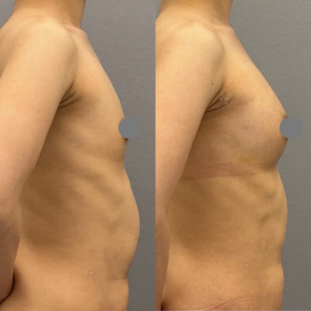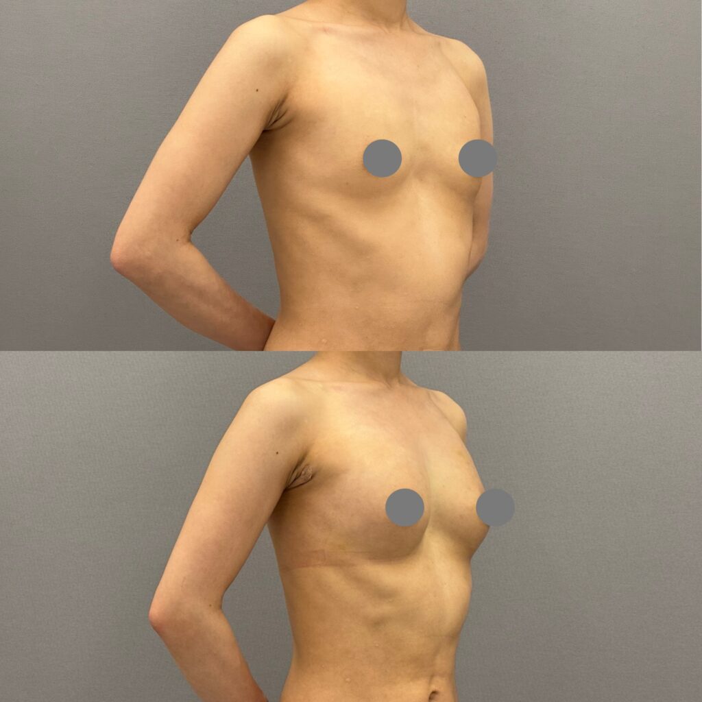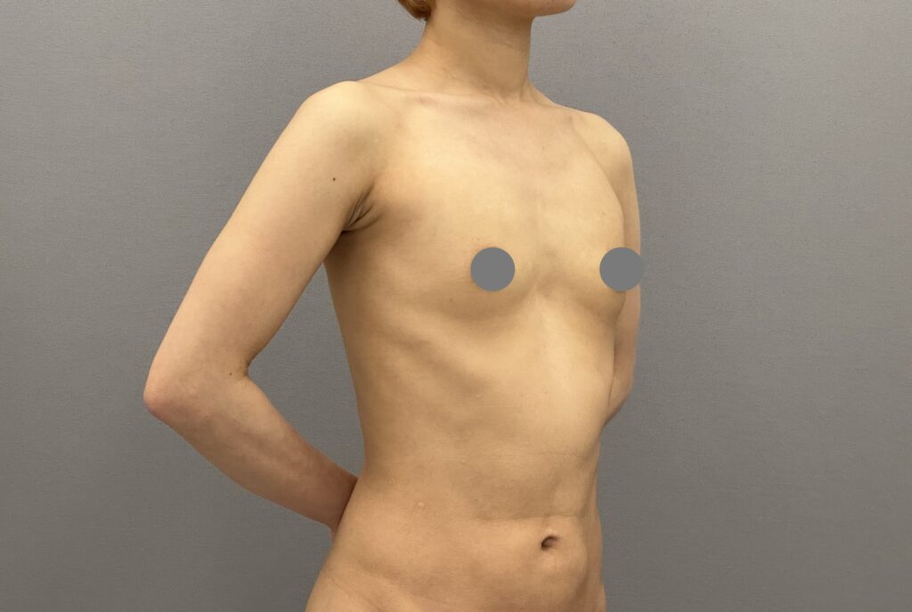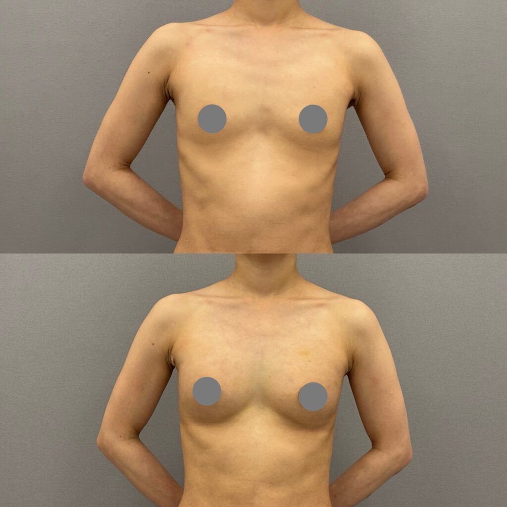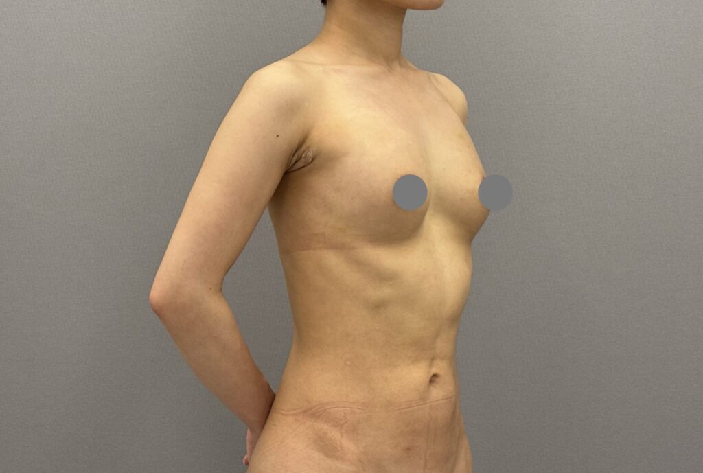 30代女性。授乳経験あり。バストが小さいことに以前から悩んでおり、授乳後のさらに気になるようになった。太ももとお尻が気になるということでしたので、痩せ型ということもあり太もも全周から採取を行なって脂肪豊胸を行いました。授乳後で皮膚の伸びがよくしっかりと注入ができてサイズアップもできました。料金:脂肪豊胸(採取4部位)1,320,000円(税込) 別途静脈麻酔代や血液検査代や固定着代がかかります。副作用・リスク:出血、感染、色素沈着、傷跡、脂肪壊死、oil cystが生じる、脂肪の定着には個人差がある、希望とするサイズにならない可能性があるなど。