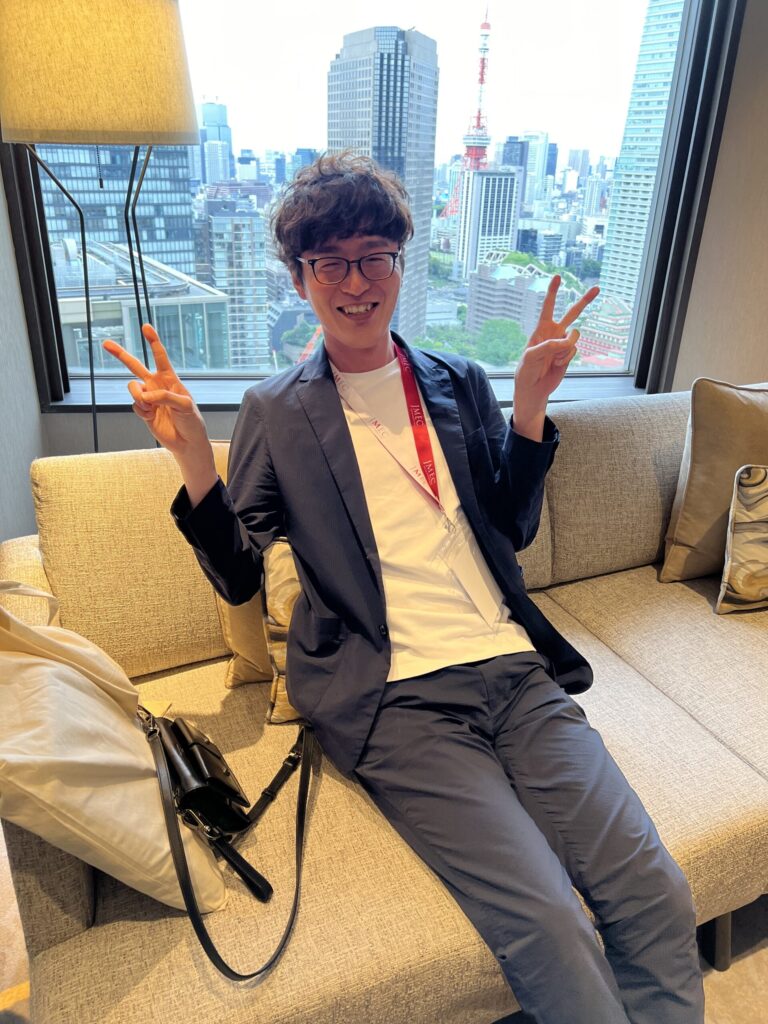 SCITON社のブースでお話ししていたら、周囲が騒がしく立ち話より静かなところでゆっくり話をできるよう用意したスイートルームでお話ししませんか?ということでお言葉に甘えてお菓子とジュースを飲みながらいろいろお話しを聞いてきました。これはスイートルームの凄さにはしゃいでいる1枚です。僕の大好きなBBL,MOXIの会社です。