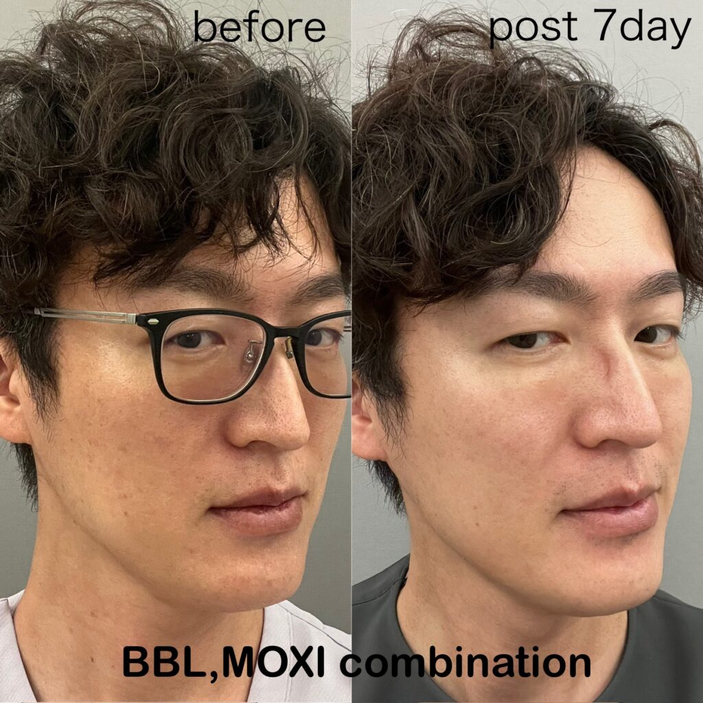 これはMOXI2回目になります。照射前は日焼けしてくすんでいましたが、照射後1週間で2段階ほどトーンアップしました。同じ写真室で撮影しています。眼鏡の有無はすみません。BBL,MOXIコンボは病みつきになるほど素晴らしいのでぜひ一度体験していただきたい治療です。