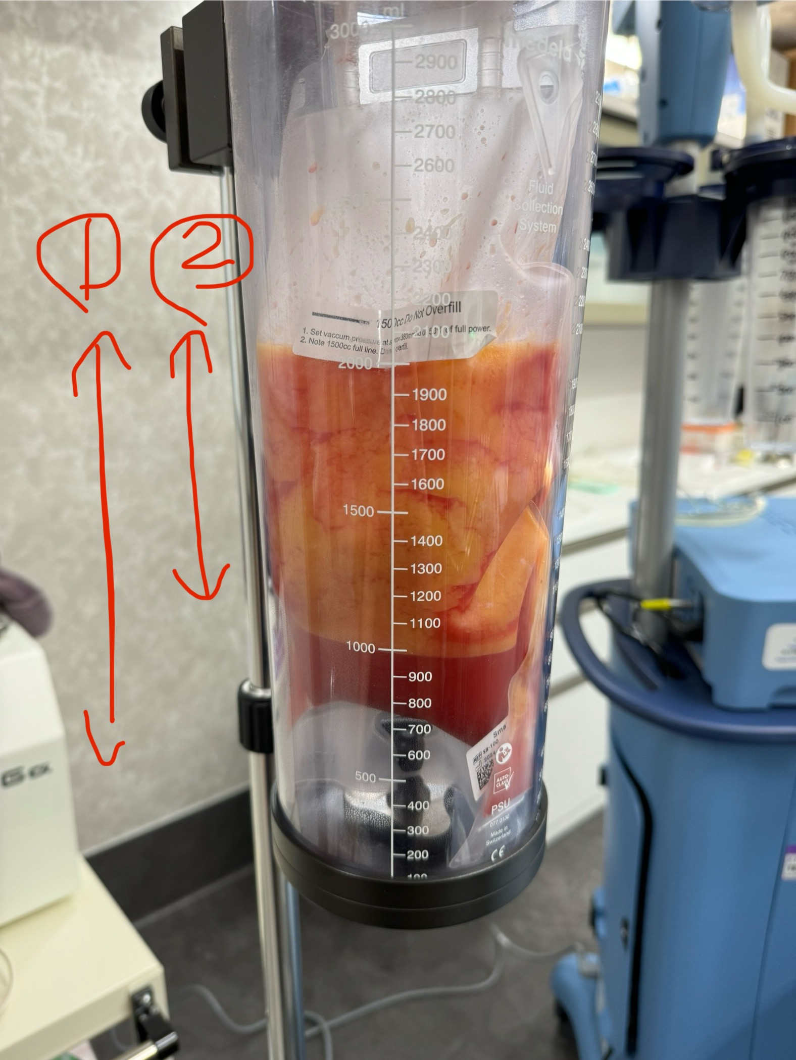 ちなみに赤色の部分は麻酔液と出血が混ざっている水分です。黄色い部分が純粋な脂肪の部分です。