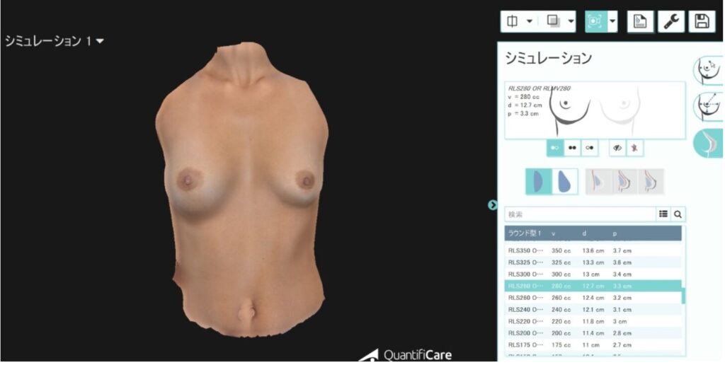 わかりやすいように右のみシリコンを入れてみました。症例写真は技術面で綺麗に仕上げてくれるんだなという指標にはなりますが、実際に自分の体でどうなるのか豊胸後にどんな胸になるのかは症例写真とは体格が違うためイメージがつきにくいですよね。このように自分の身体でシミュレーションできるとイメージがしやすいですし、自分の体にあった自然なサイズ感を選べます。今回はセレフォーム280cc 幅12.7cm 高さ3.3cm です。モティバで言うところのMINIになる形状です。こんな形でモティバもセレフォームもどちらも全ての種類で術前シミュレーションができます。